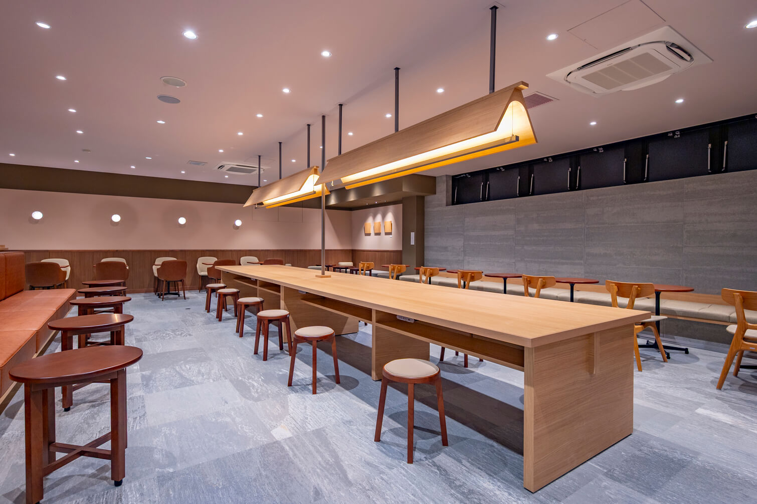 仕事の合間に立ち寄れるテーブル席や、ほっと一息落ち着くことのできるソファ席など、